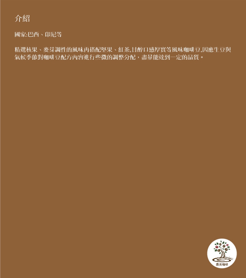 精選核果、麥芽調性的風味再搭配堅果、紅茶,甘醇口感厚實等風味咖啡豆,因應生豆與氣候季節對咖啡豆配方內容進行些微的調整分配,盡量能達到一定的品質。