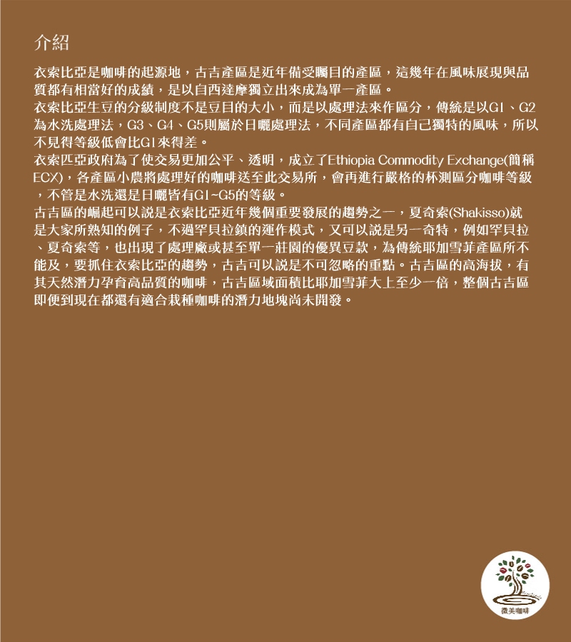 商品名稱:[微美咖啡]-衣索比亞 谷吉 柯爾夏鎮 咪恰恰處理廠 特優級 G2 日曬 Ethiopia Guji Kercha Hestia Michicha Banko G2 Natural 咖啡豆