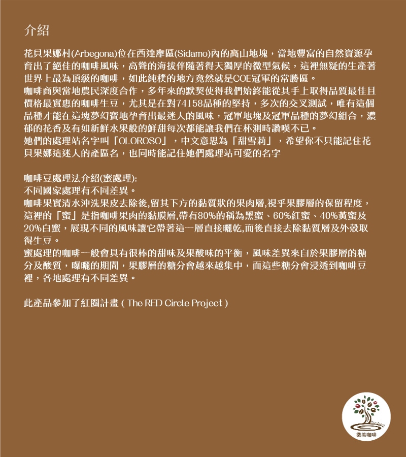 商品名稱:[微美咖啡]-衣索比亞 西達摩 花貝果娜村 甜雪莉處理站 74158 TOP G1 黃蜜處理 Ethiopia Sidamo Arbegona Oloroso Station 74158 Yellow Honey TOP G1 咖啡豆