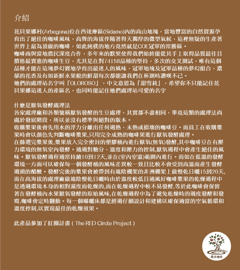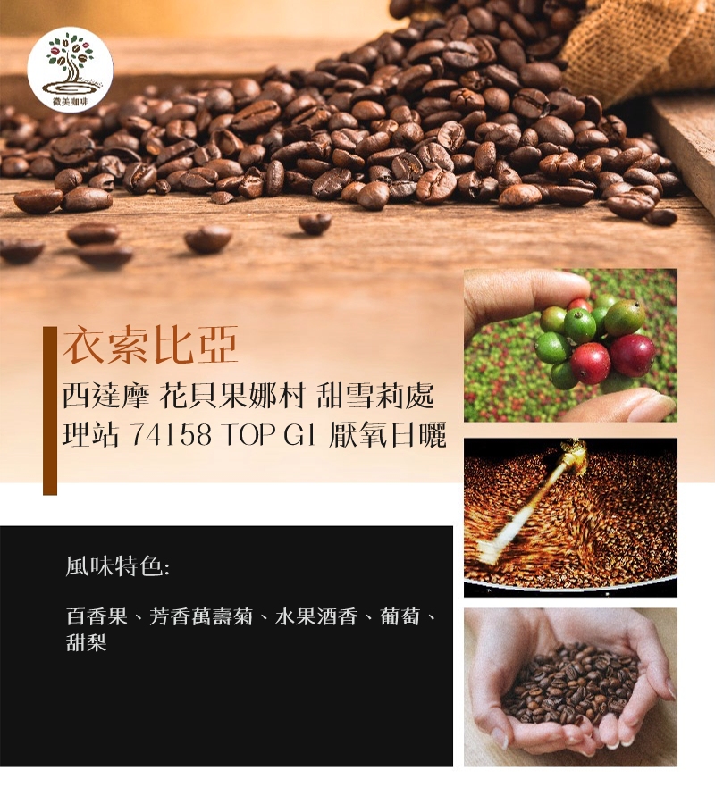 商品名稱:[微美咖啡]-衣索比亞 西達摩 花貝果娜村 甜雪莉處理站 74158 TOP G1 厭氧日曬 Ethiopia Sidamo Arbegona Oloroso Station 74158 Anaerobic Natural TOP G1 咖啡豆