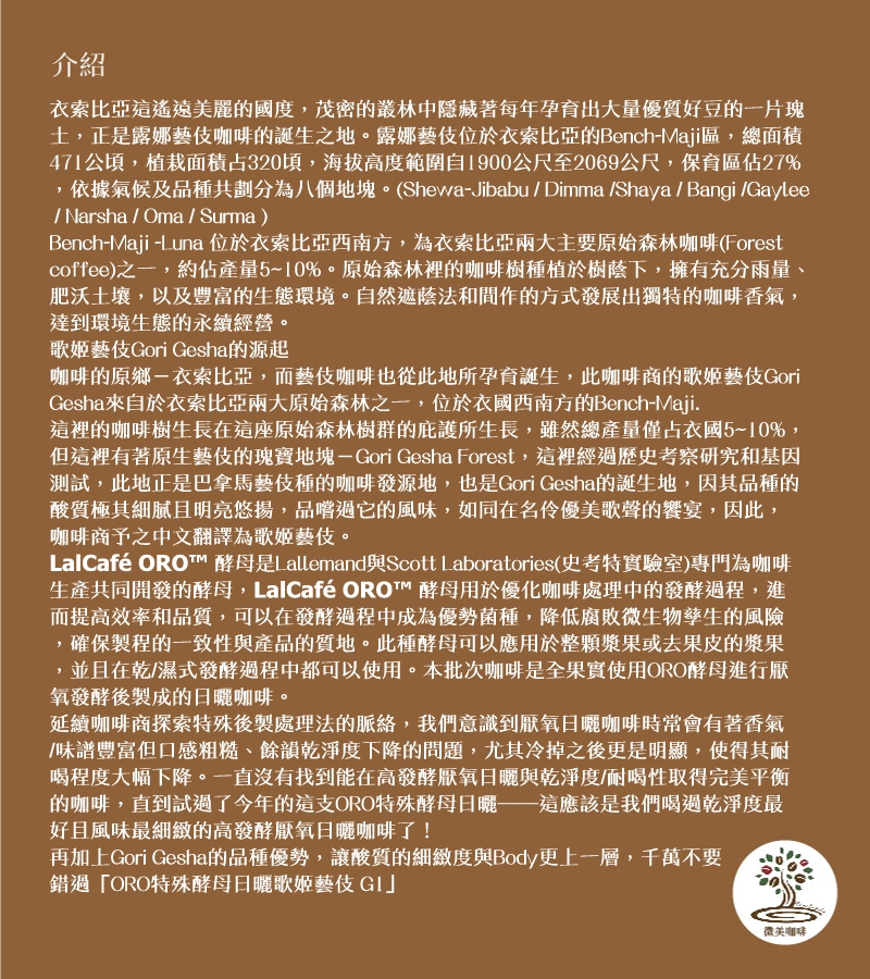 商品名稱:[微美咖啡]-衣索比亞 班吉麻吉 歌姬藝伎 G1 ORO酵母日曬 Ethiopia Bench Maji Gori Gesha ORO Yeast Natural G1 咖啡豆