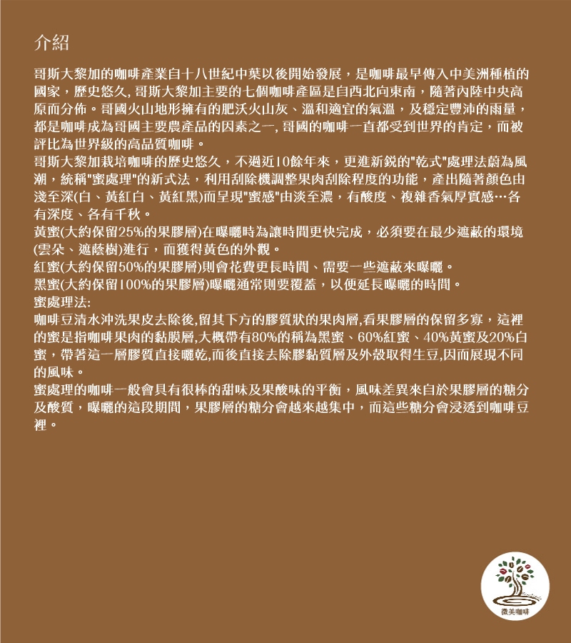 商品名稱:[微美咖啡]-哥斯大黎加 布蘭卡 奇里波山谷 里瓦斯人處理廠 SHB 蜜處理 Costa Rica Brunca Chirripo Rivense Honey SHB 咖啡豆